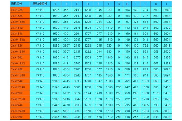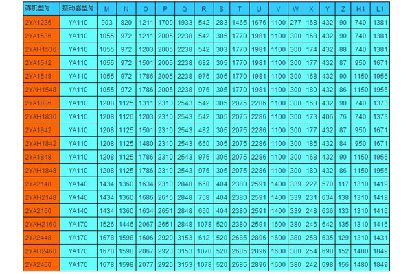 表一 YA 型圓振動篩技術性能及參數