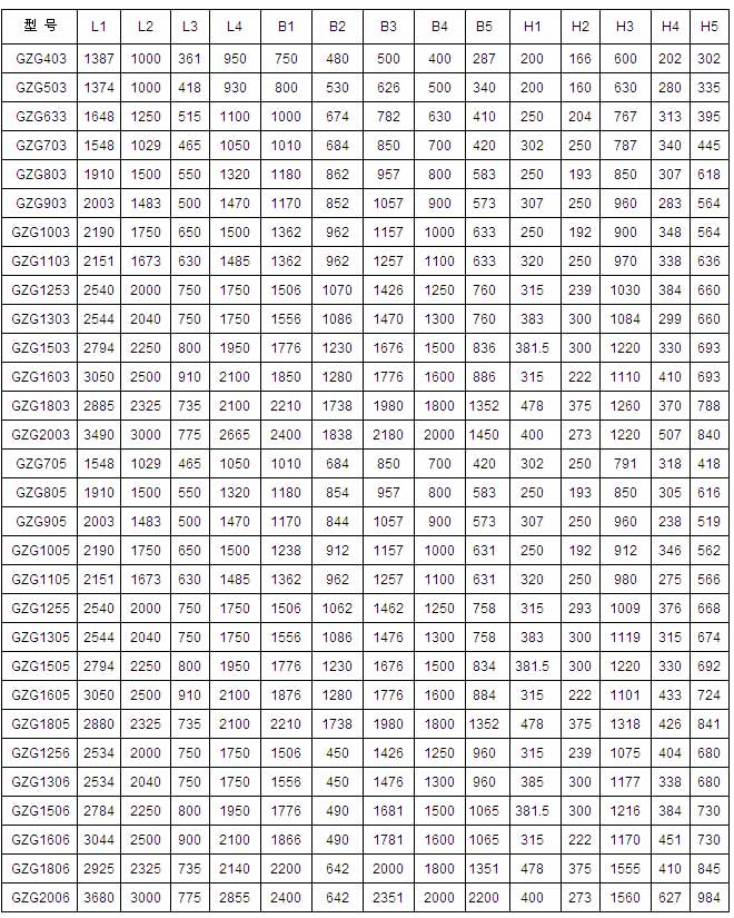 GZG403 400×1000×200 30 40 100 1450 4 ZG405 380 2×0.73 50 2×0.25 198